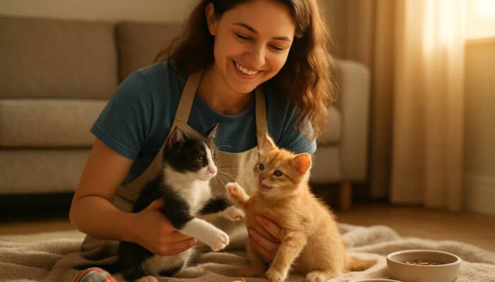 Fostering Kittens Temporarily: A foster caregiver playing with playful kittens on soft blankets in a sunlit room, surrounded by toys.