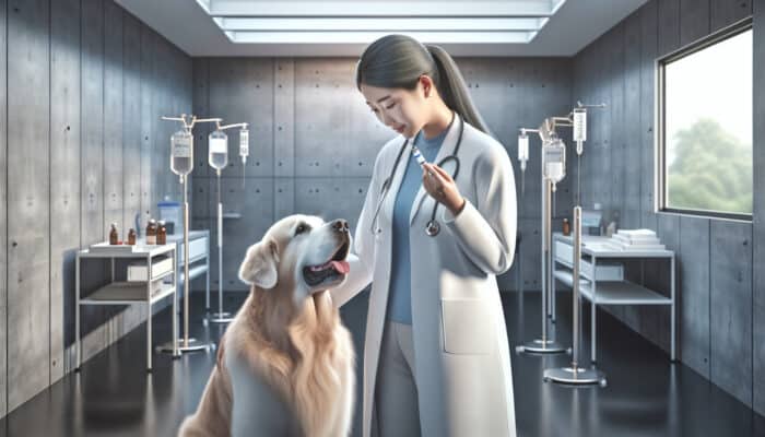 Veterinarian gently giving pain relief to elderly golden retriever on a soft bed in a cozy clinic with medical tools.